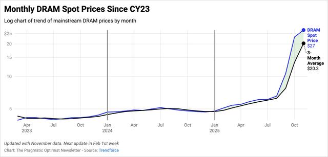 从当前市场数据来看,作为 HBM 核心原料的 DRAM,其现货价格在去年 8 月至 11 月间暴涨 4 倍,这为美光科技(Micron,MU)等内存制造商创造了极为有利的盈利环境。