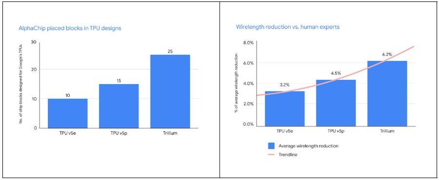 谷歌在三代 TPU(v5e、TPU v5p) 中 AlphaChip 设计芯片块的数量与平均线长减少量