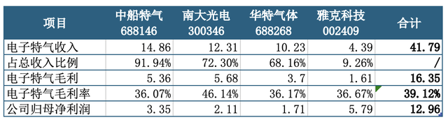 尽管面临重重困难,但我国企业已在电子特气领域取得了初步成效。我国A股已经有超15家厂商发力电子特气市场,此外也有不少创业企业瞄准电子特气领域,并获得了融资。多家上市公司如 $中船特气(SH688146)$ 、 $南大光电(SZ300346)$ 、 $华特气体(SH688268)$ 在电子特气领域的收入均已突破10亿元,且毛利率基本维持在36%以上,电子特气产品已经可以实现输血功能。