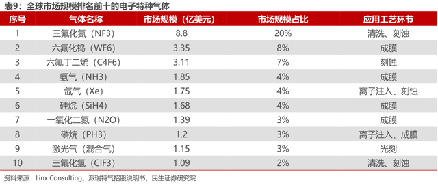 2021年全球市场规模前十的电子特气,资料来源:民生证券研究院