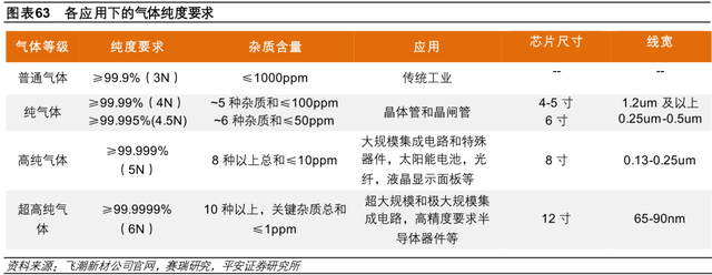 我国之所以难以占据较大的电子特气市场份额,原因在于电子特气全产业链的技术壁垒极高。电子特气的纯净度要求极为严苛。纯净度包含纯度与洁净度两个指标,其中纯度指的是主成分的含量越高越好,洁净度指的是杂质的残留量越低越好。目前对于90纳米制程的纯度要求在5N或6N,同时杂质要求小于10-9,也就是十亿分之一。对于更精细的制程要求则要更高,金属元素要净化到万亿分之一。