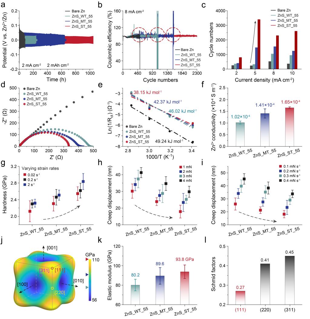 图2. ZnS (111)织构强度主导的电极循环稳定性、电化学动力学及力学强度差异。电极循环稳定性:a,对称电池的恒电流锌沉积/剥离循环性能(2.0 mA cm-2,2.0 mAh cm-2);b,半电池的库伦效率测试(8.0 mA cm,1.0 mAh cm-2);c,不同电流密度下的循环服役寿命。电化学动力学:d-f,对称电池的阻抗谱、反应活化能及离子电导率的对比分析。力学强度:g,不同应变率下的纳米压痕硬度;h-i,不同最大载荷及加载速率下的蠕变测试;j,闪锌矿相ZnS的弹性模量各向异性计算;k,纳米压痕实测ASEI弹性模量;l,施密特因子计算。