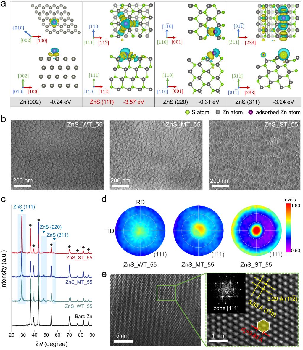 图1. ZnS ASEI的晶体取向调控机制与多尺度结构表征。a,锌离子在Zn (002)、ZnS (111)、ZnS (220)及ZnS (311)等不同晶面上的吸附构型、吸附能及差分电荷密度分布;b-e,具有(111)择优取向的ZnS ASEI的SEM图像、掠入射X射线衍射(GIXRD)、(111)取向极图及高分辨TEM图像。