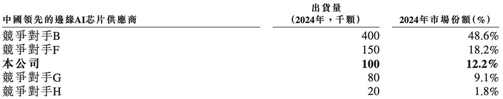 根据灼识咨询的数据,按2024年出货量计,爱芯元智是全球第一大中高端视觉端侧AI推理芯片提供商(市占率为24.1%)、全球第五大视觉端侧AI推理芯片提供商(市占率为6.8%)、中国第二大国产智能驾驶SoC供应商(售出超过51.8万颗智能汽车SoC)、中国第三大边缘AI推理芯片供应商(市占率为12.2%)。