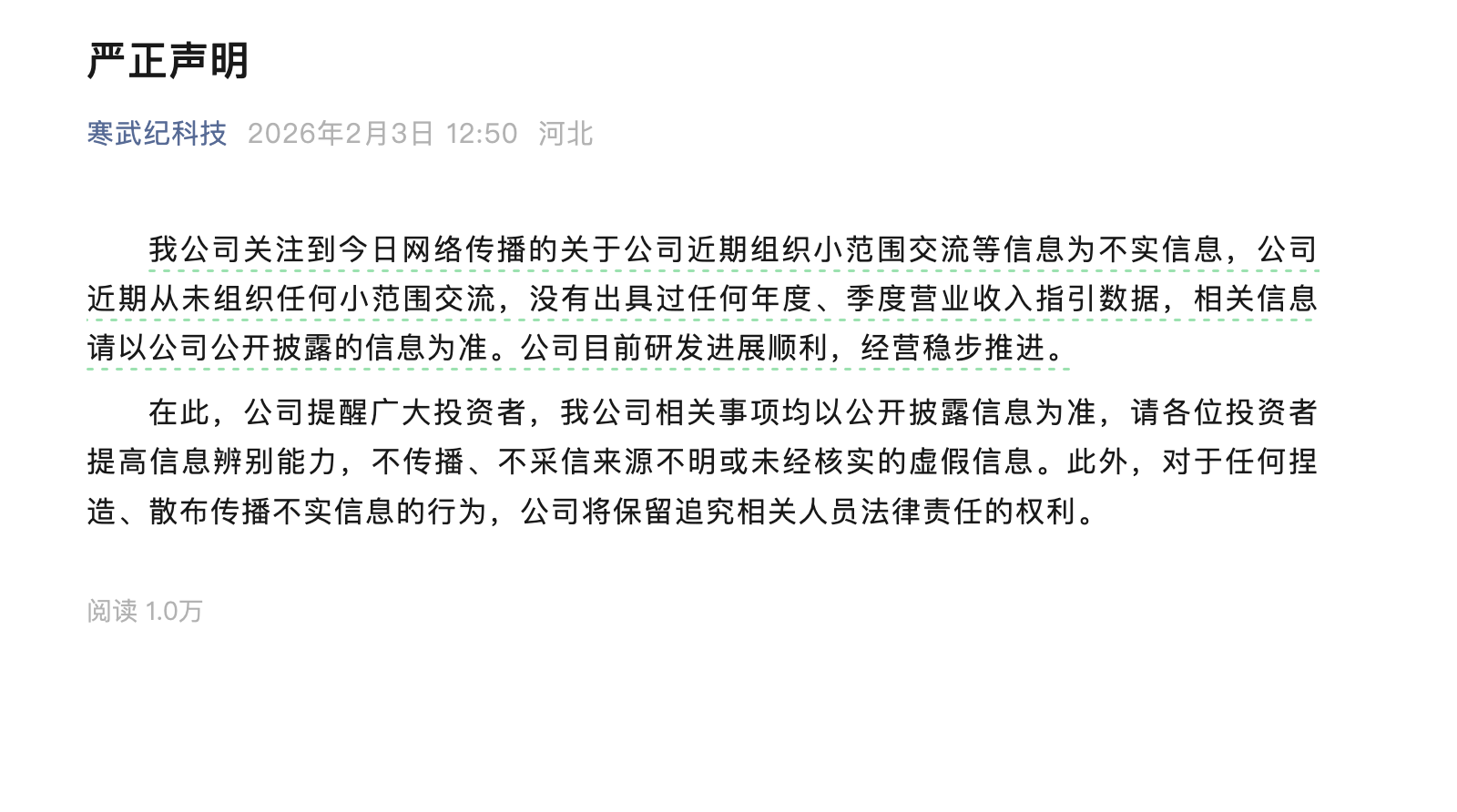 凤凰网科技讯 2月3日,寒武纪发布声明称,公司关注到今日网络传播的关于公司近期组织小范围交流等信息为不实信息,公司近期从未组织任何小范围交流,没有出具过任何年度、季度营业收入指引数据,相关信息请以公司公开披露的信息为准。公司目前研发进展顺利,经营稳步推进。
