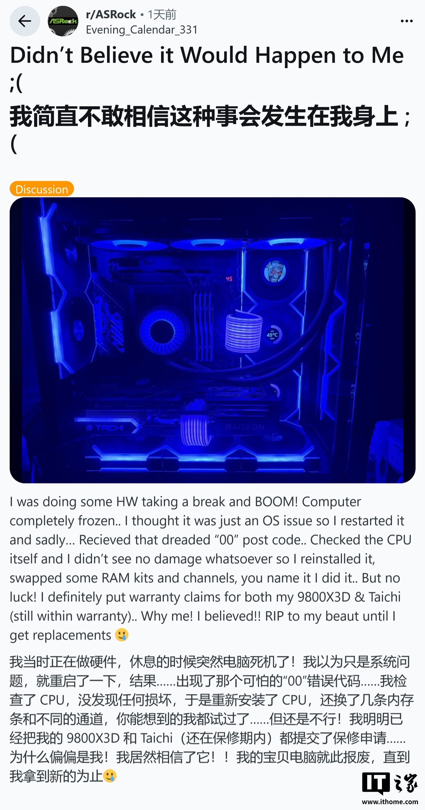 用户 u/Evening_Calender_331 的 Ryzen 7 9800X3D 处理器在华擎 X870E Taichi(太极)主板上宣告报废,且故障发生时同样运行在最新的 BIOS 版本下。