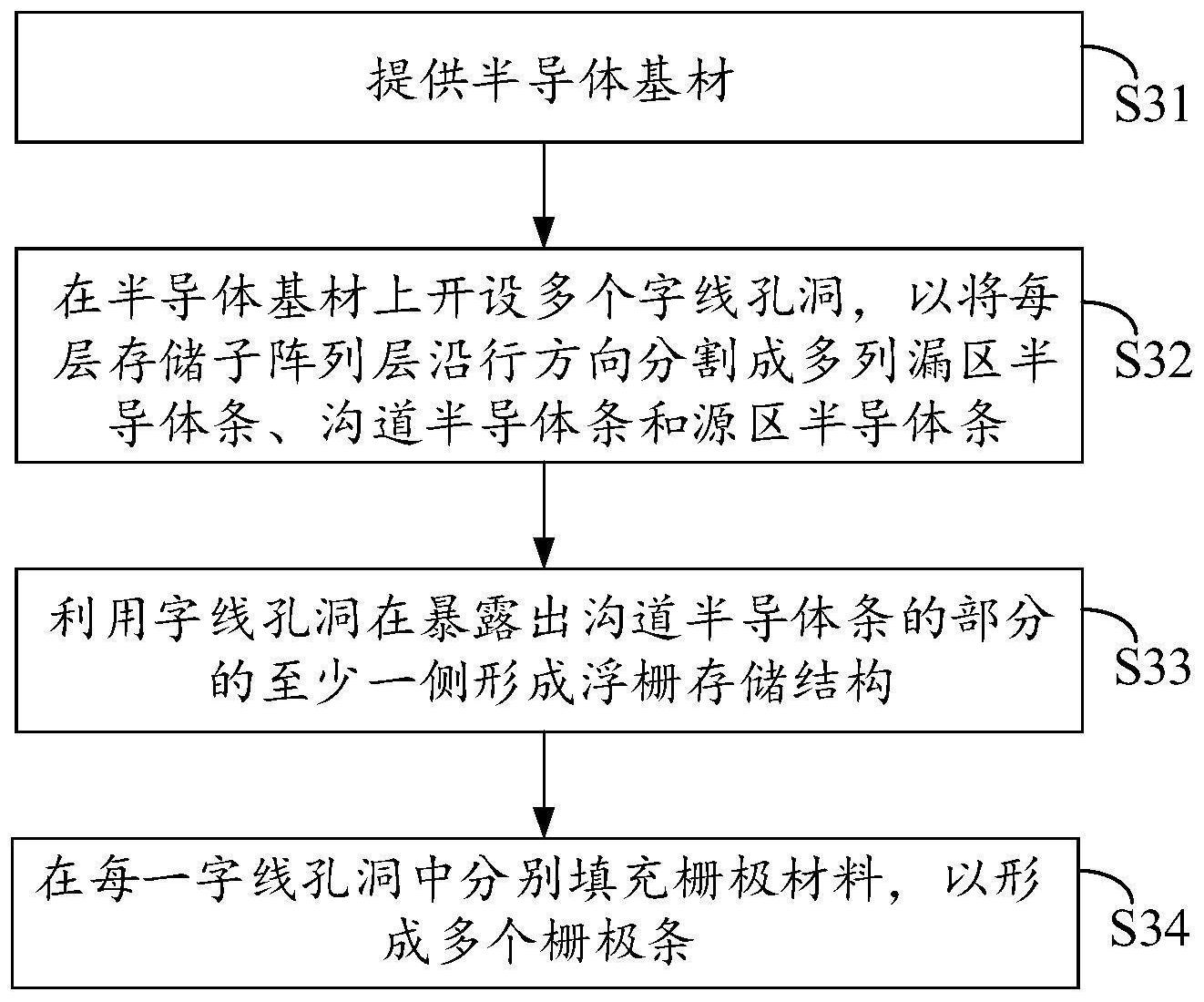 本申请提供一种存储块及其制程方法、存储单元。该方法包括:提供一半导体基材;在半导体基材上开设多个字线孔洞,以将半导体基材上的每层存储子阵列层沿行方向分割成多列漏区、沟道和源区半导体条;利用字线孔洞在暴露出沟道半导体条的部分的至少一侧形成浮栅存储结构;在每一字线孔洞中分别填充栅极材料,以形成多个栅极条,每条栅极条至少有部分与每层存储子阵列层中的一条对应的沟道半导体条的部分在一投影平面上的投影重合,栅极条的部分、沟道半导体条的相应部分及夹设在二者之间的浮栅存储结构的部分、与沟道半导体条的相应部分相邻的漏区半导体条的部分和源区半导体条的部分,构成一个存储单元。该方法所制得的存储块的存储密度较高。