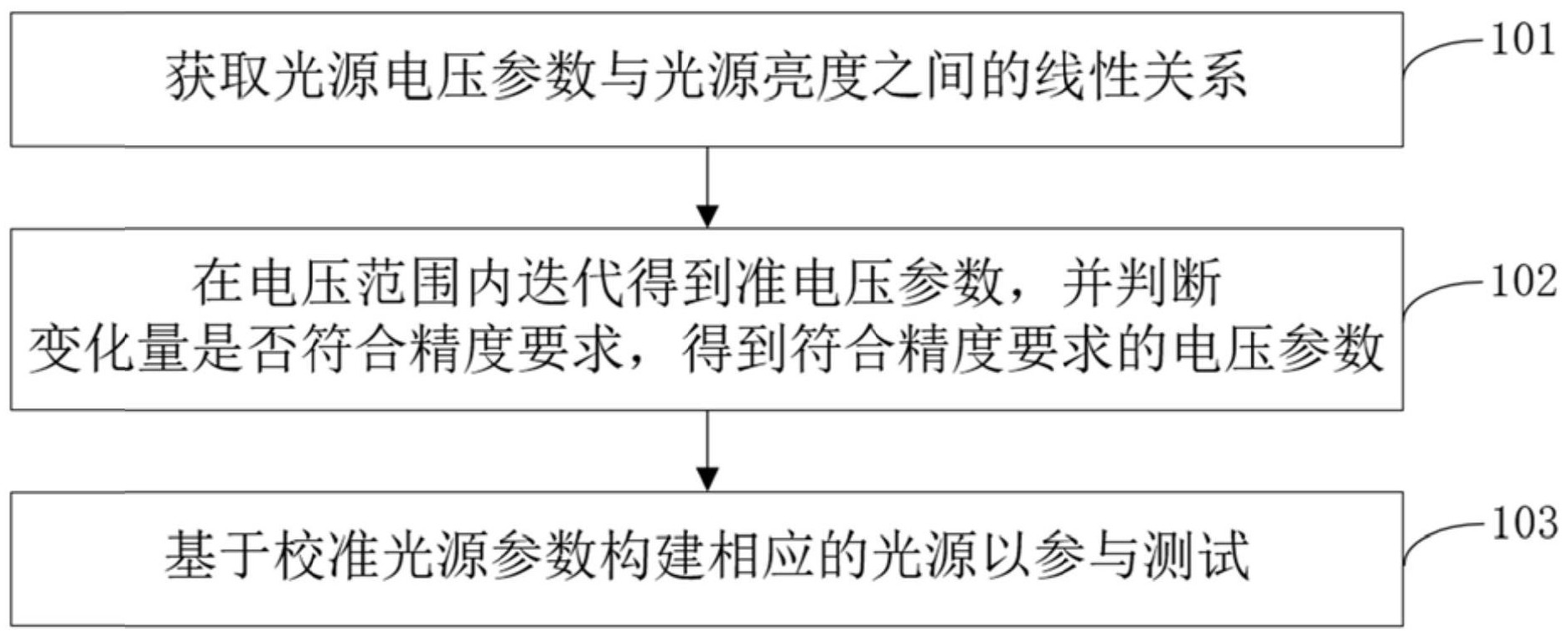 本发明提出了一种光学芯片测试的光源校准方法、装置及光学芯片测试系统。方法包括:获取在预设可测电压范围内光源电压参数与光源亮度之间的线性关系;基于预设规则选取准电压参数,获取在准电压参数下的光源亮度的测量值和理论值以得到每个准电压参数对应的变化量,判断每个变化量是否符合预设精度要求;将符合预设精度要求的准电压参数作为校准光源参数,基于校准光源参数构建相应的光源以参与光学芯片的测试。本发明基于梯度下降算法的思想,兼顾稳定性和高效性,无论在任何精度要求环境下,光源校准都能在短时间内完成,校准次数少,校准效率高,精准高效地实现光源校准,进而提升芯片测试效率。