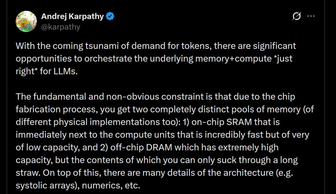 这正是卡帕西所说的“设计最优物理基板,编排内存与计算,以求最快、最便宜地获取token”的现实注脚。