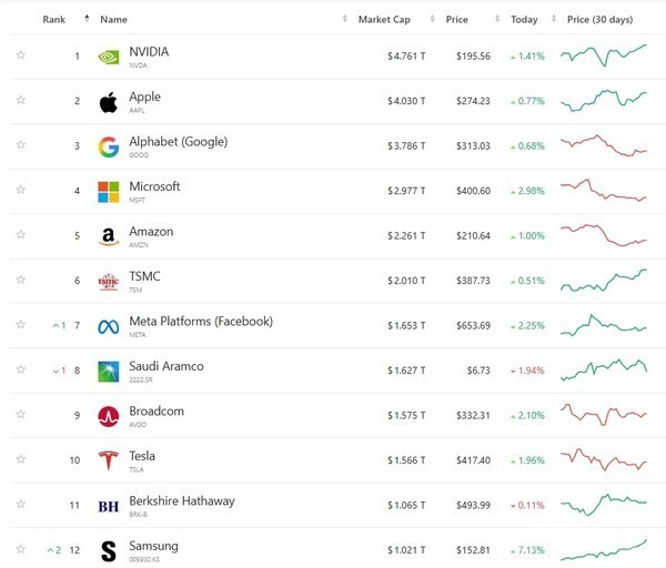 在亚洲范围内,三星电子的市值排名第三,仅次于位列全球第6位的中国台湾半导体制造公司(台积电,TSMC)与第7位的沙特阿拉伯国家石油公司(沙特阿美,Saudi Aramco)。全球市值最高的公司是美国芯片设计公司英伟达(NVIDIA),其市值高达4.761万亿美元。