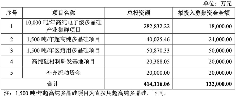 本次IPO,鑫华科技拟募资13.20亿元,主要投资于10000吨/年高纯电子级多晶硅产业集群、1500吨/年超高纯多晶硅、1500吨/年区熔用多晶硅及高纯硅材料研发基地项目。