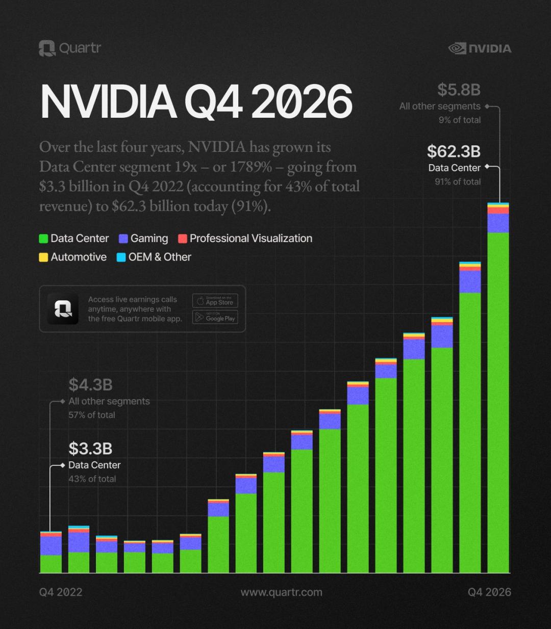 英伟达的数据中心业务,在2026年Q4的收入达到了623亿美元,同比增长75%,撑起了公司超过91%的收入。