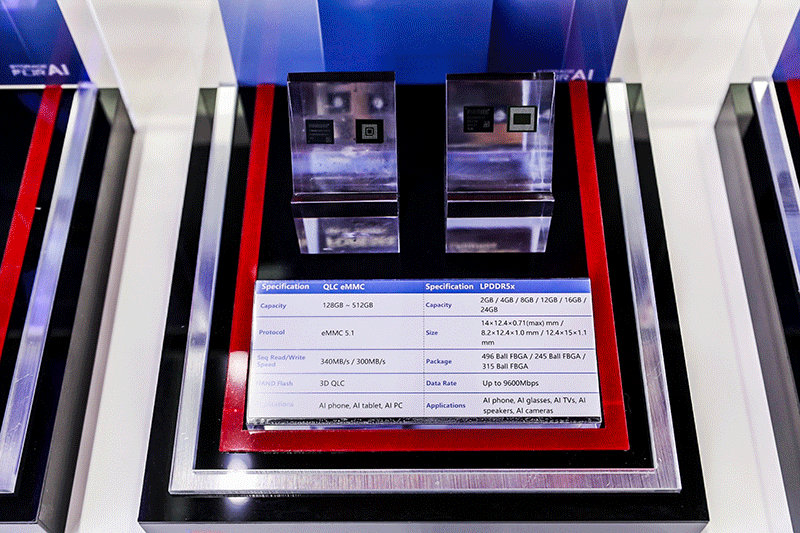江波龙此次还展示了面向 AI 可穿戴设备的 ePOP5x。其合封了 LPDDR5x 内存与 eMMC 5.1 闪存,在保持与 ePOP4x 相同尺寸的基础上,封装厚度缩减 35%、最薄处仅 0.52mm,同时 DRAM 传输速率高达 8533Mbps,支持多种容量组合配置。