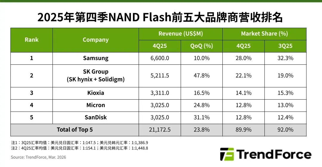 根据TrendForce集邦咨询最新调查,2025年第四季全球NAND Flash产业营收持续受惠于AI建设需求,前五大品牌厂营收合计大幅季增23.8%,达211.7亿美元。