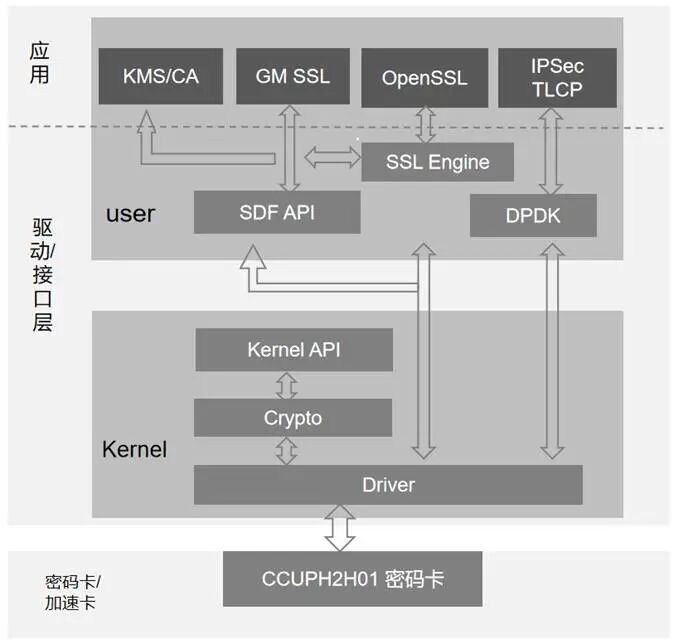 SDF API:用户态接口参考《GM/T 0018-2023 密码设备应用接口规范》,支持该规范中的用户应用程序调用接口。