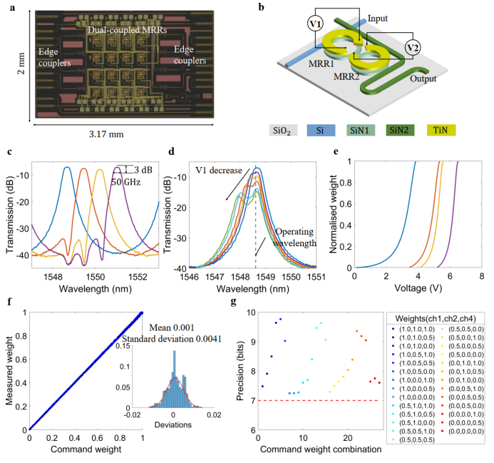图2 基于3D双耦合微环光交叉阵列的光计算单元(OCU):(a)芯片光镜图;(b)权重单元;(c)光谱特性;(d) 权重调控;(e)权重电压映射曲线;(f-g)任意权重组合下的权重部署(f)实验与理论对比散点图以及(g)精度