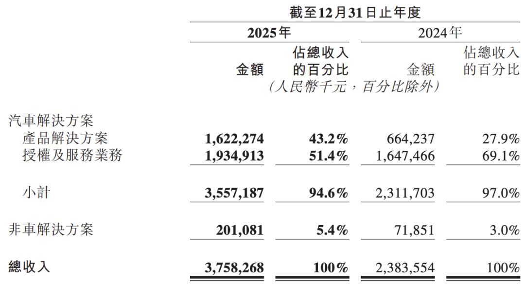地平线收入主要来源于两大板块,产品解决方案、授权及服务业务。
