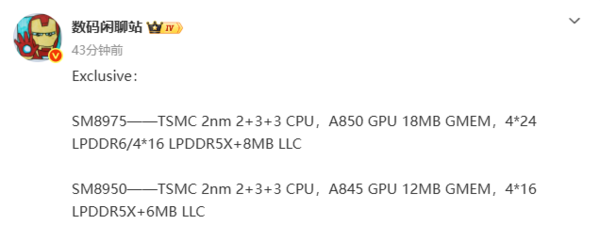 【CNMO科技消息】3月25日,数码博主“数码闲聊站”曝光了第六代骁龙8至尊版系列的参数信息。爆料信息显示,该系列将首次推出SM8975与SM8950两款移动平台,均采用台积电2nm工艺制程,标志着安卓旗舰芯片正式迈入2nm时代。
