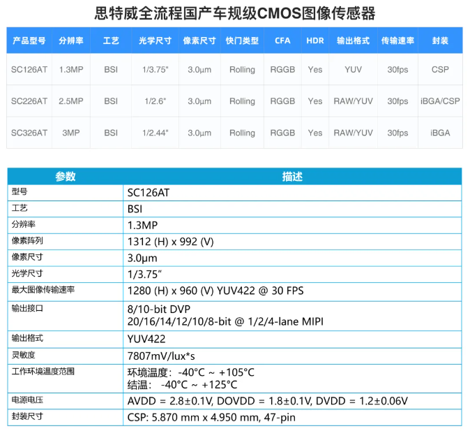 SC126AT 作为思特威全流程国产化高性能车载 CIS 系列的拓展新品,兼顾性能与成本优势,可与已推出的同系列车载 CIS 产品 SC226AT 和 SC326AT,共同组成覆盖车载环视、前视及后视摄像头应用的国产高性能 CIS 影像方案。