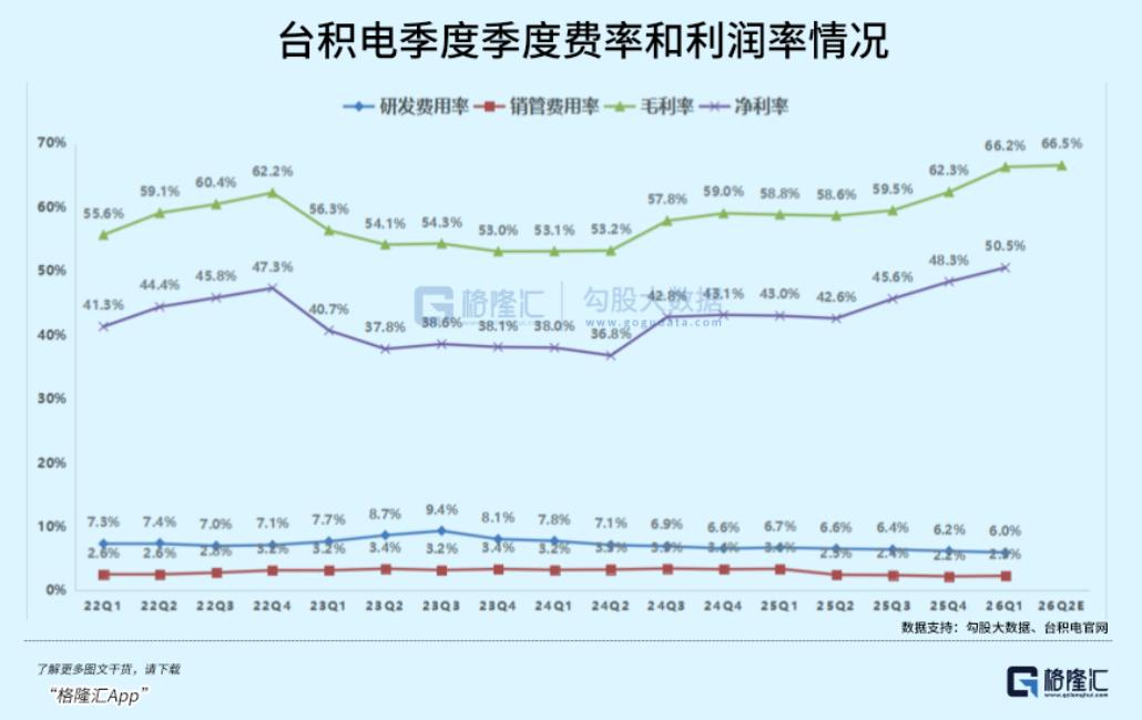 在传统制造业看来,超过60%的毛利率通常只存在于奢侈品或高度垄断的医药行业。但台积电Q1毛利率冲上66.2%,且Q2指引最高触及67.5%,这背后并非简单的“涨价”二字可以概括。