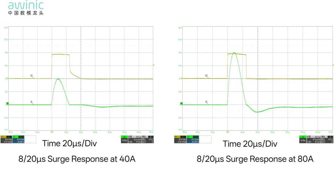 艾为全新推出AW403063TCSR,其搭载独特反馈机制,实现精准平缓钳位,在200V、8/20µs浪涌电流冲击下,能将系统接触电压牢牢控制在40V以下,实现5mohm的动态电阻,轻松抵御雷击、电网波动等带来的高功率瞬态冲击。