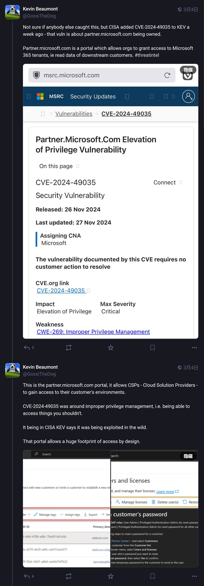 该漏洞涉及微软合作伙伴门户的权限提升问题,可能被恶意利用。尽管微软声称已修复漏洞,但有传言称部分租户的邮箱可能已被入侵。