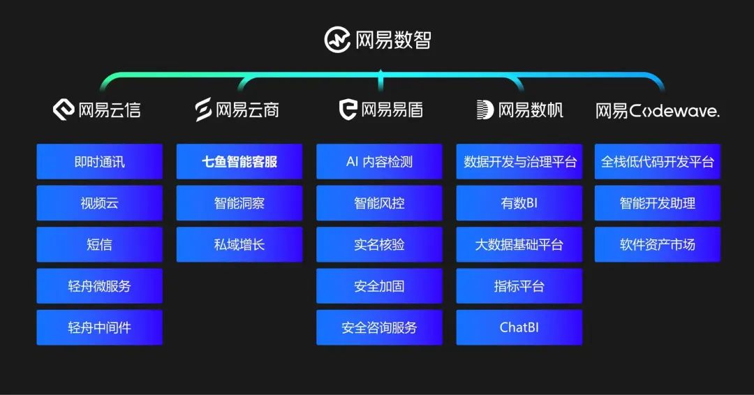 以网易易盾、网易云信、网易云商、网易数帆、CodeWave ,聚焦于数字内容风控、融合通信和云原生PaaS、服务营销一体化、全链路数据开发治理及分析、应用智能开发五大核心领域,提供一站式企业数智化转型解决方案。