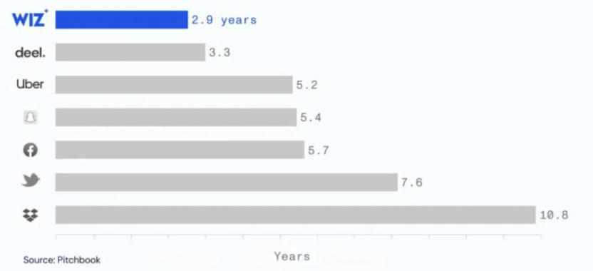 Wiz作为网络安全公司,成立于2020年,创造了18个月达到1亿美元ARR的最快纪录。在2024年5月,Wiz宣布其ARR达到3.5亿美元左右,7月,Wiz的ARR达到5亿美元,并计划在2025年达到10亿美元。根据数据分析机构Pitbook的统计, Wiz只用了2.9年的时间,就成为了估值100亿美元的公司。