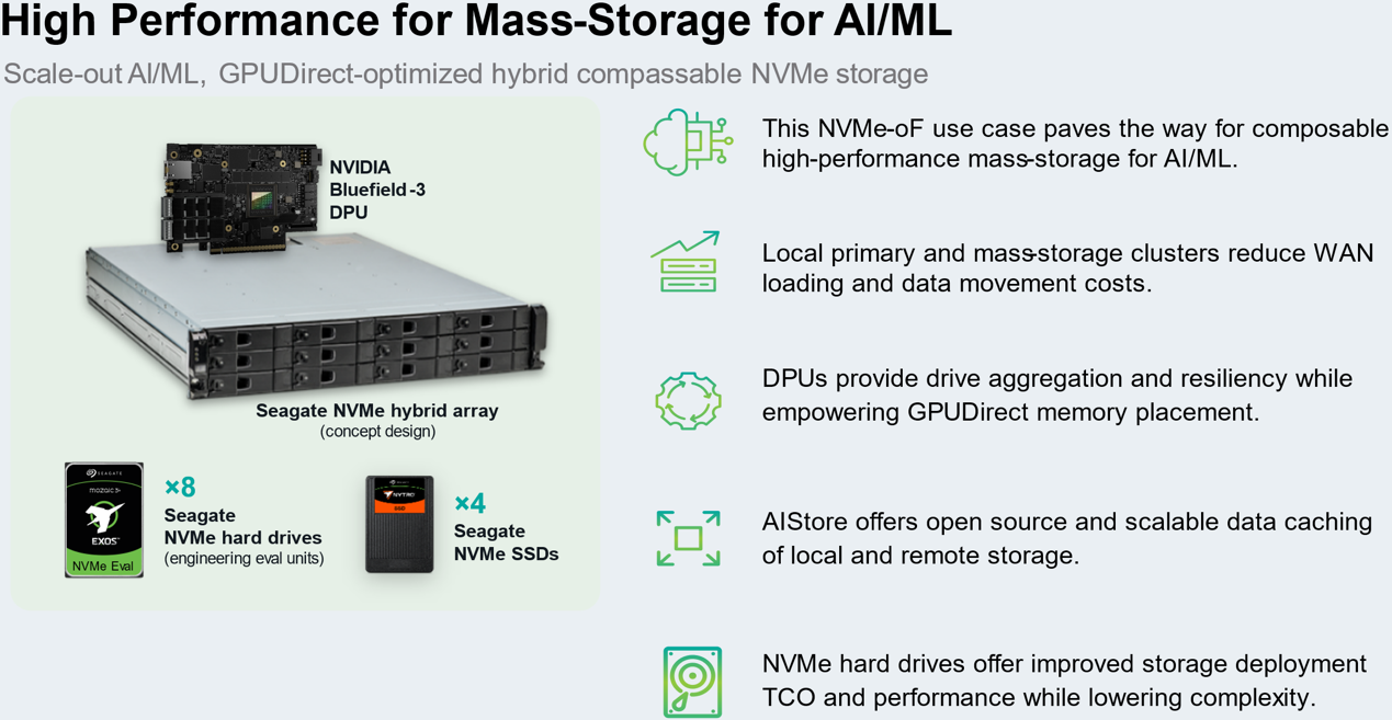 根据希捷的描述,该系统搭载 8 块 NVMe 机械硬盘和 4 块 NVMe 固态硬盘缓存,与英伟达 BlueField 3 DPU 直连,相比经过 CPU,可减少 30% 的数据传输延迟。