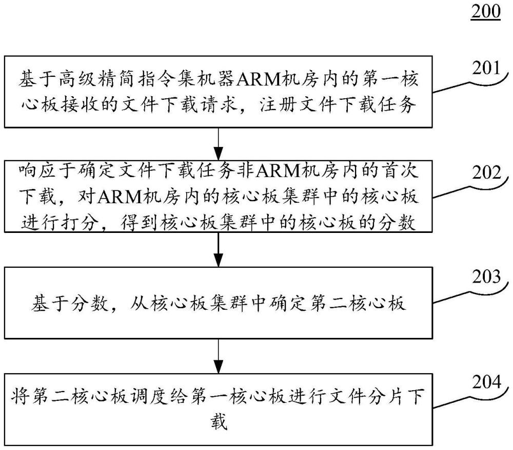 本公开提供了一种文件分发方法和装置,涉及云计算技术领域,具体为云手机技术领域。该方法的一具体实施方式包括:基于高级精简指令集机器ARM机房内的第一核心板接收的文件下载请求,注册文件下载任务;响应于确定文件下载任务非ARM机房内的首次下载,对ARM机房内的核心板集群中的核心板进行打分,得到核心板集群中的核心板的分数;基于分数,从核心板集群中确定第二核心板;将第二核心板调度给第一核心板进行文件分片下载,其中,第一核心板将文件分片拼接成文件。