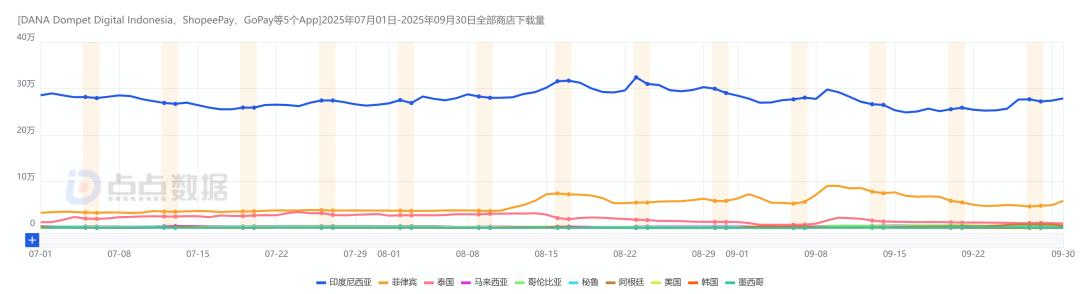 数字钱包作为东南亚数字金融生态的基础设施,已成为竞争最激烈的核心赛道。点点数据监测显示,该领域在TOP50榜单中占据13个席位,其中前三位均被数字钱包类应用包揽。印度尼西亚凭借其庞大的人口基数和快速发展的数字生态,成为数字钱包企业的必争之地——《DANA》、《GoPay》、《OVO》等本土应用通过与出行、电商、餐饮等生活场景的深度绑定,构建了难以撼动的用户生态。