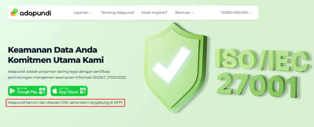 《Adapundi》官网首页展示了其获得了OJK授权并通过了相关信息安全认证