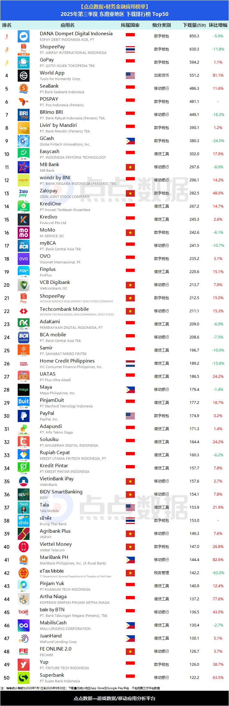 依托互联网移动应用大数据平台“点点数据”(https://app.diandian.com/),点点出海最新发布的《2025年第三季度东南亚财务金融App下载榜TOP50》显示,区域市场竞争格局正在加速重构。这一趋势的背后,是东南亚经济活力的持续释放、金融数字化进程的全面提速,以及无现金支付习惯的广泛普及——这些因素共同为数字钱包、智能信贷、移动银行等领域的金融科技企业,提供了结构性的出海机遇。