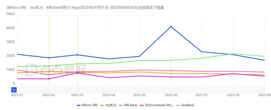 《SeaBank》、《BRImo》、《myBCA》、《MB Bank》、《Techcombank》年初以来月下载量皆保持稳定趋势