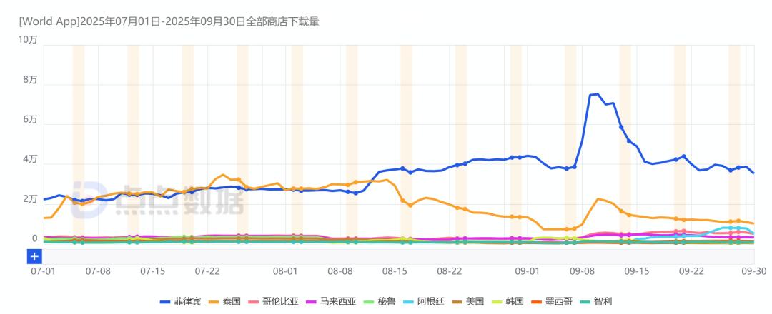 《Worldcoin》2025Q3地区下载量趋势.点点数据 菲律宾、泰国、马来西亚贡献了其全球下载量中近8成的数据占比