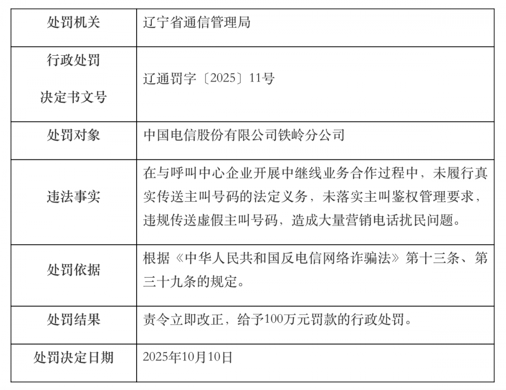 其中,处罚对象中国电信股份有限公司铁岭分公司,在与呼叫中心企业开展中继线业务合作过程中,未履行真实传送主叫号码的法定义务,未落实主叫鉴权管理要求,违规传送虚假主叫号码,造成大量营销电话扰民问题。责令立即改正,给予100万元罚款的行政处罚。