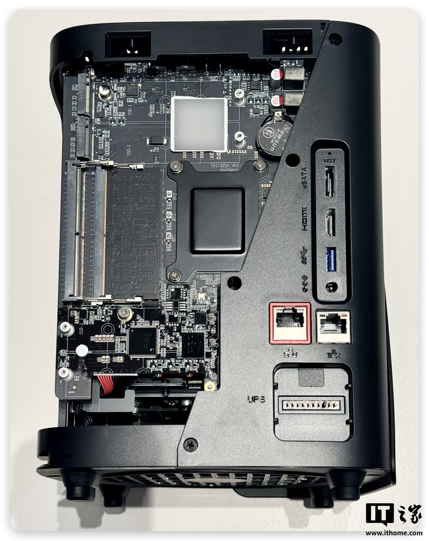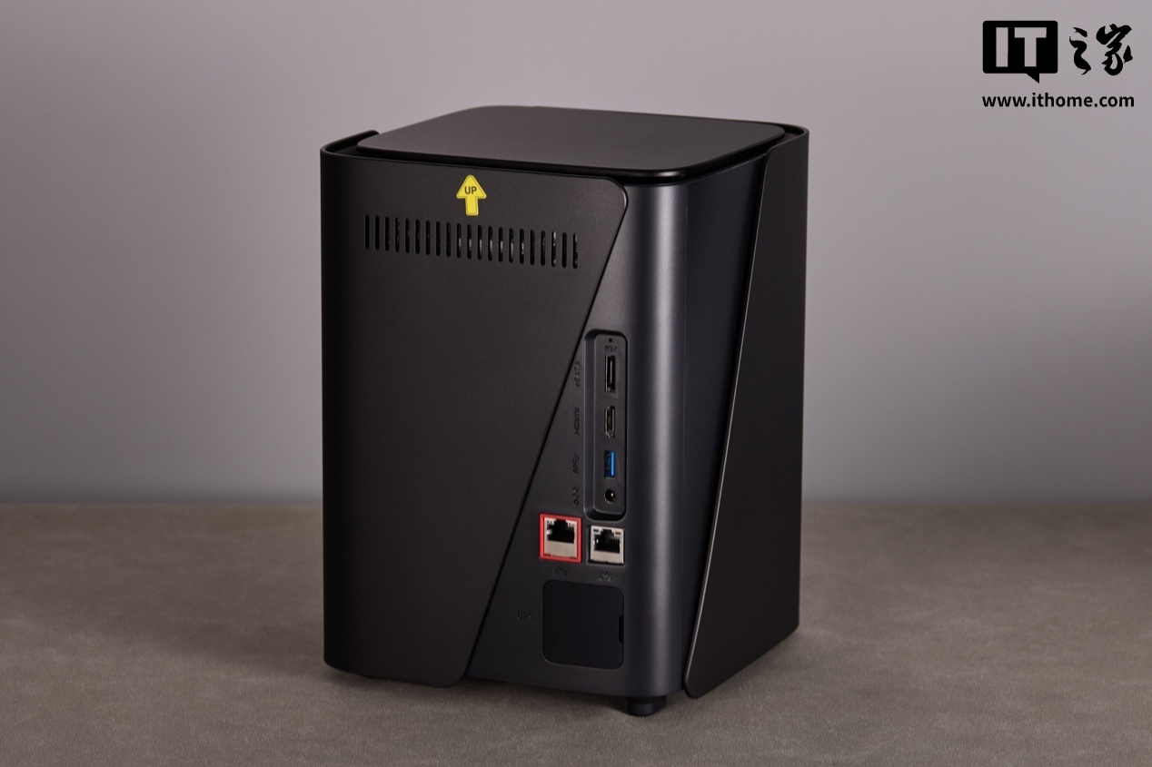 机身背部为接口区域,从上到下依次为用于外接硬盘柜的 eSATA 接口、HDMI 2.1 接口、USB 3.2 Gen2 接口、供电接口、一个万兆网口(红色)、一个千兆网口,以及最下方的 UPS 接口。接口的参数给得可以说非常满了。