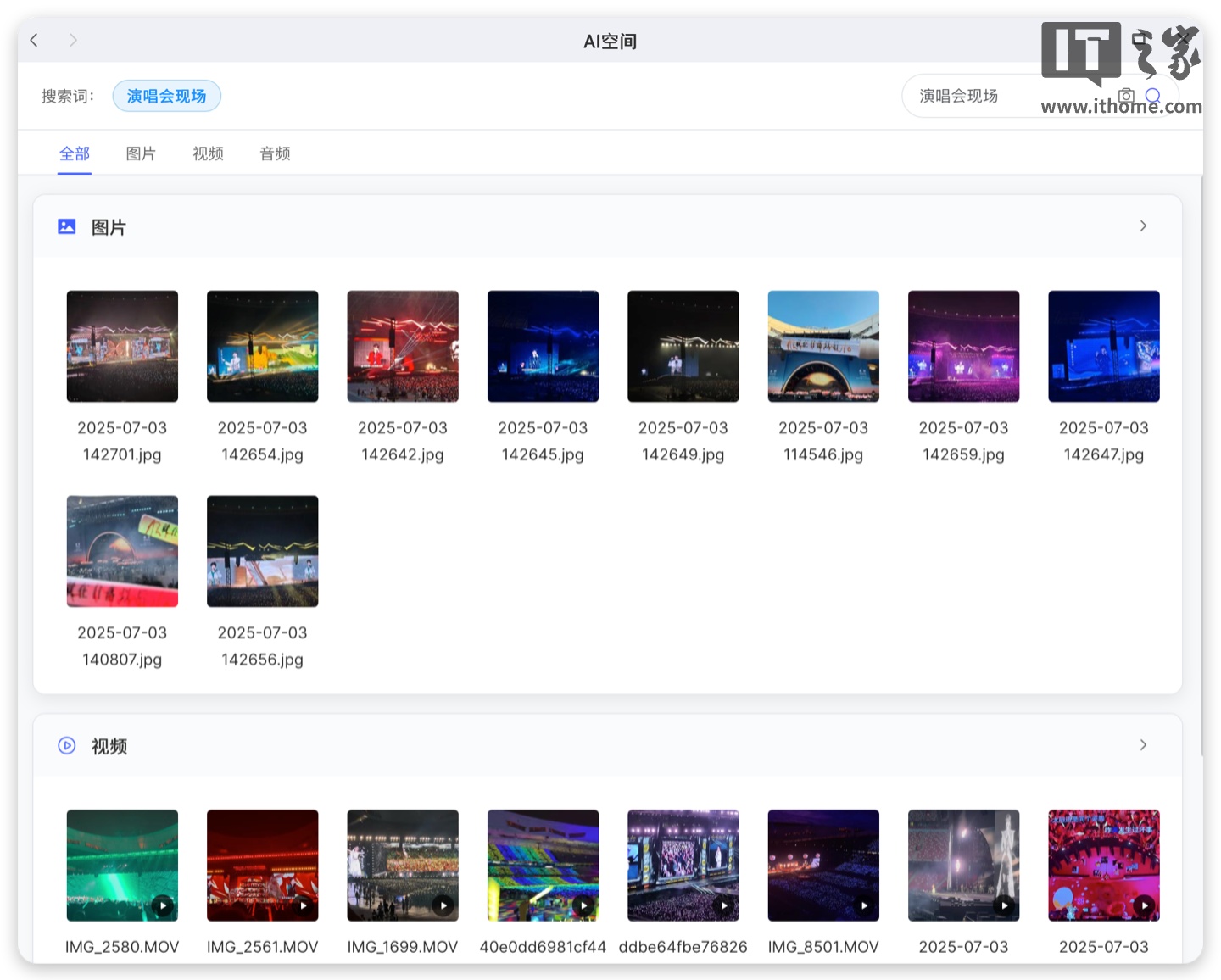 比如我们搜索,演唱会现场,可以看到,AI 快速地把文件夹中符合「演唱会现场」的图片、视频都呈现了出来。