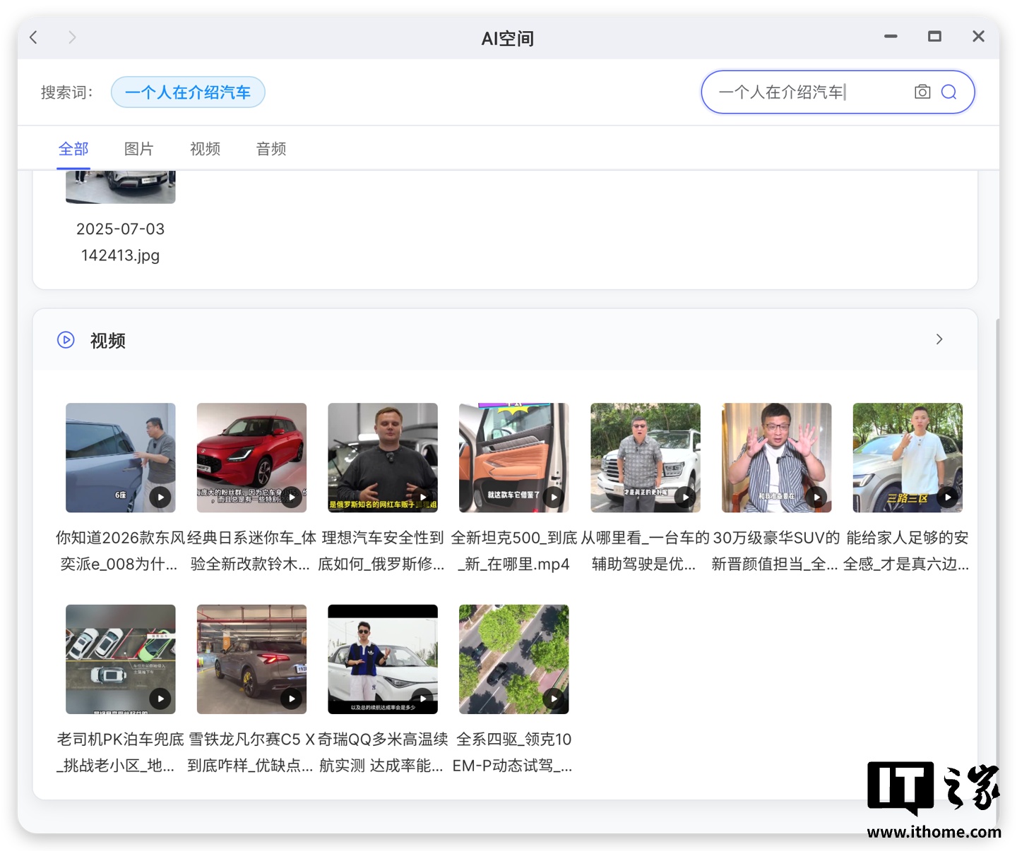 并且除了照片,对于视频的识别也非常准确,比如搜索「一个人在介绍汽车」,就能根据视频的内容,准确找到相关文件。