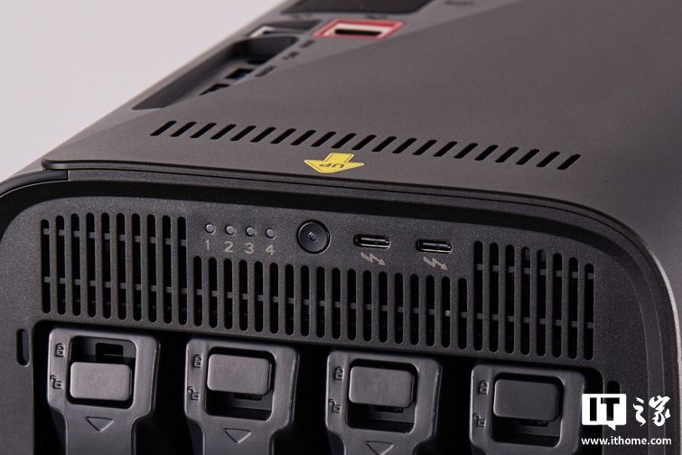 机身顶部的接口由前代的 USB-A + USB-C 更换为了双雷电四接口,这让 Z425 有了外接雷电扩展坞的能力,无论是外接独立显卡,还是外接雷电网桥,都完全可行,让 Z425 原本就已经很强悍的性能进一步得到拓展,如虎添翼。