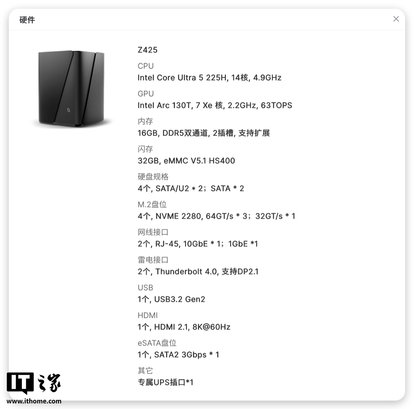 作为定位旗舰的产品,极空间 Z423 给的配置就很足,在 Z425 上,也是更进一步,除了上文所述的满配接口以外,性能上也是没有含糊,CPU 从前代的 AMD 锐龙处理器更换为了 Intel Core Ultra 处理器,IT之家拿到的这台配备了 Core Ultra 5 225H 14 核处理器,主频最高可达 4.9GHz,AI 方面,更有 CPU、GPU、NPU 整合的 83TOPS 的 AI 能力。显卡则是 Intel Arc 130T,这套配置,无论是作为家庭数据中心,还是影音服务器,都是绰绰有余的,双雷电 4 接口甚至为 Z425 带来了外置显卡扩展能力,Z425 的硬件配置甚至已经超越了传统的家用 NAS 范畴。设备的详细配置,可以参考下图。