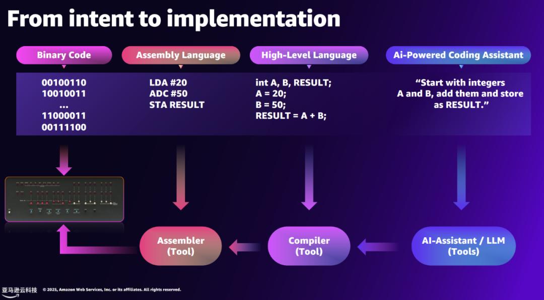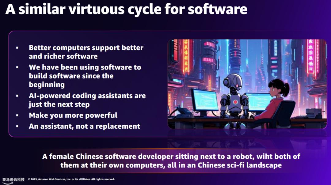 Jeff Barr 在主题为「下一代软件开发」的演讲中强调:「AI 驱动的开发工具,并非什么彻底的革命,而是我们开发工具演进中合乎逻辑的下一步 (logical next step)。」