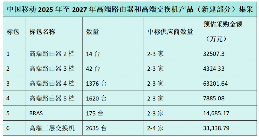 根据此前发布的招标公告,该项目集中采购产品为高端路由器、BRAS、高端三层交换机,预估采购规模高端路由器3052台、BRAS设备175台、高端交换机2635台。预计本次采购需求满足期为两年。