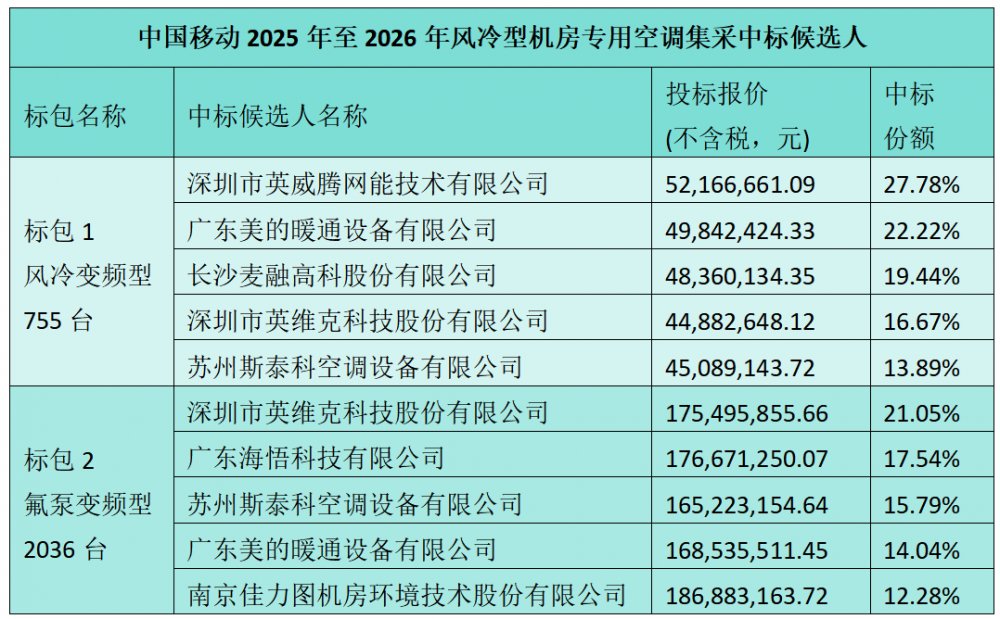 C114讯 10月28日消息(九九)中国移动采购与招标网日前发布2025年至2026年风冷型机房专用空调产品集中采购项目中标候选人公示,英维克等七家中标。