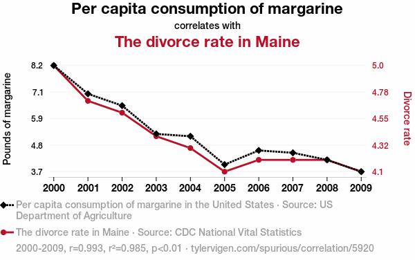 这样的荒唐例证,在实际工作之外,还拥有大量趣味佐证。哈佛法学院学生Tyler Vigen干脆搞了一个恶趣味网站 (Spurious Correlations),收录各种拟合完美但根本牛马不相及的数据组合。其中最广泛传播的一组图显示,美国缅因州的人均黄油消费曲线,与该地区同期离婚率高度一致,同涨共跌仿若神奇暗号!