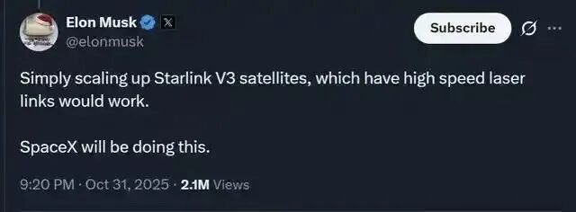 马斯克凭借一己之力扛起宣传大旗,一连几条推特“带货”,先是在10月31日发布推特公布SpaceX未来将在太空部署数据中心,又在谷歌宣布太空数据中心计划时留下“interesting”的评论。