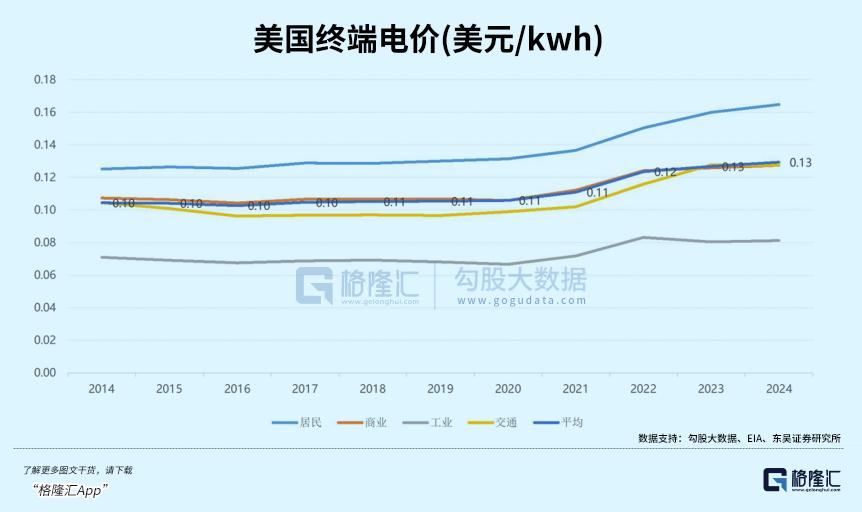 电力短缺直接推高了用电成本,美国终端电价逐年上涨,2024年平均电价已达0.13美元/kwh,而数据中心密集区域的批发电价波动更大,企业不得不通过长期协议锁定价格。解决电力缺口、保障供电稳定,成为美国AI产业发展的当务之急,也为储能市场打开了广阔空间。