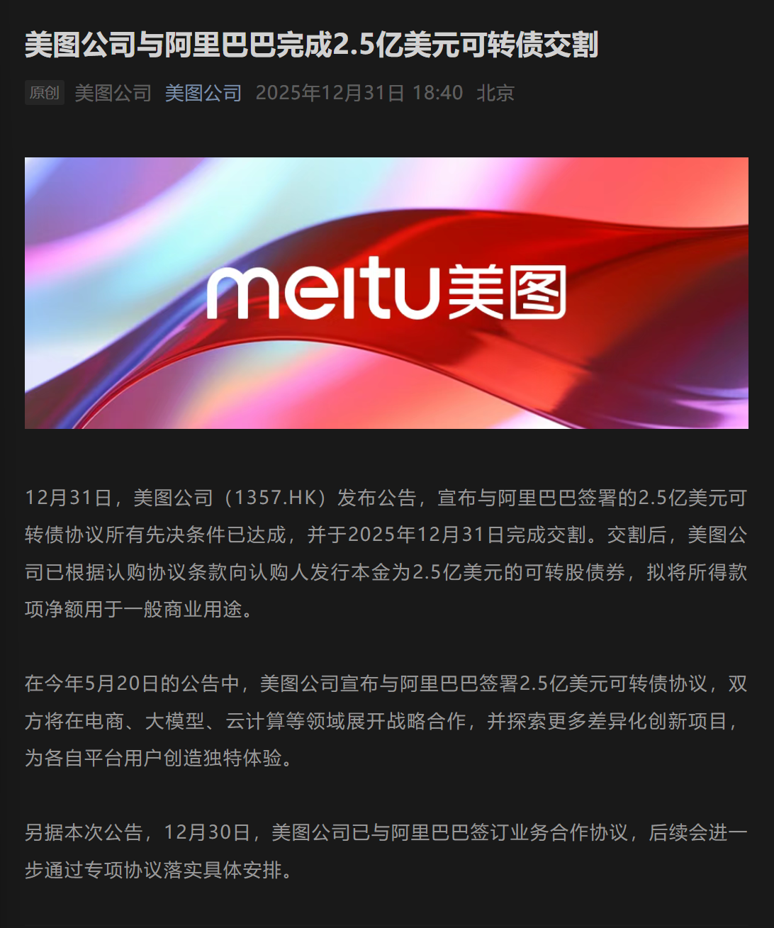 凤凰网科技讯 2025年12月31日,美图公司(1357.HK)公告称,与阿里巴巴签署的2.5亿美元可转债协议所有先决条件已达成,且于当日完成交割,美图已发行本金2.5亿美元的可转股债券,所得款项净额拟用于一般商业用途。