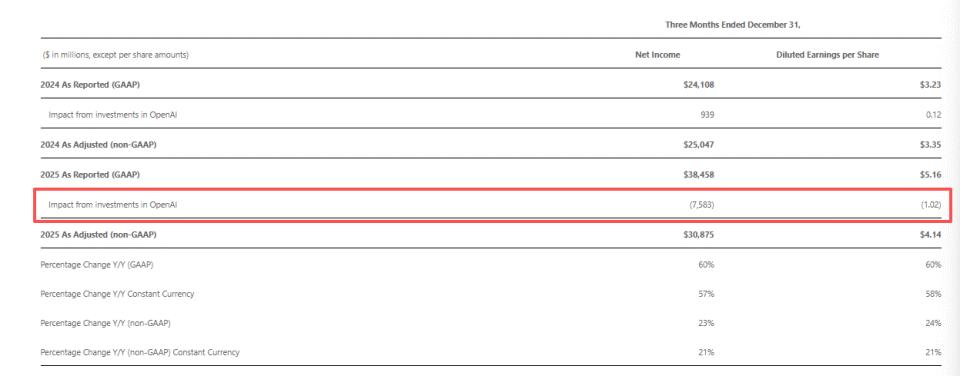 很重要的一个原因:尽管微软当季利润增长惊人,但很大程度上得益于与OpenAI重组相关的一次性76亿美元收益。若剔除这部分,调整后净利润增长为23%,虽仍稳健,却远不及表面那般“亮眼”。