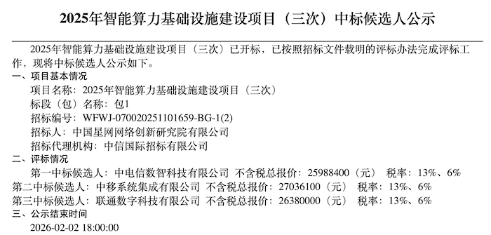 C114讯 2月2日消息(南山)日前,中国星网公示2025年智能算力基础设施建设项目的中标候选人。中电信数智科技有限公司力压两家竞争对手,排名第一。